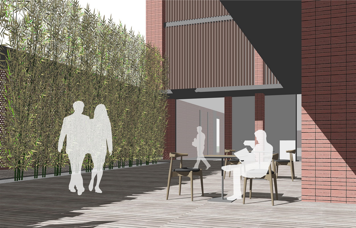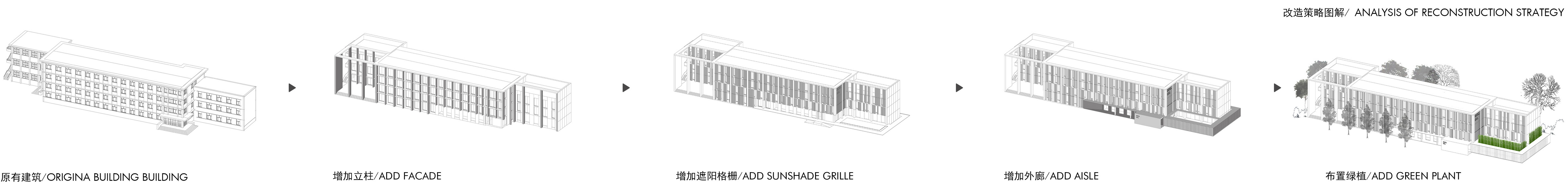 One of the development trends of future education is diversified teaching methods. The original building is a conventional classroom model evenly distributed along the inner corridor, and there is a relative lack of open space. The facade reconstruction design adjusts and optimizes the space on the first floor, adjusts the position of the main entrance, locally changes the original exterior wall window into a door opening, and adds an exhibition gallery outside it to provide a place for communication and display activities. The southwest corner and southeast corner enclose the turning point of the original building volume with a colonnade to form two courtyards to enhance communication and blur the internal and external boundaries. The East colonnade is the horizontal extension of the exhibition gallery, and the courtyard is equipped with green plants to create a more comfortable and pleasant communication and rest space.