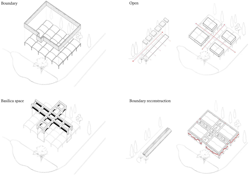 The ideal garden is a place for free wandering, as well as space for both order and memorial. The design extends the base scale, and opens the roof to form a cross intersection shared arcades along two axis direction in the ground , which we call it as the reconstruction of basilica space. The arcades divides the plan into four independent and connected areas, and establishes the connection between the building and the perimeter of the site. The original interface was reconstructed, and the original wall materials were recycled, which were used to create a new interface with the new bricks. Different materials are inscribed with different times, which are manifested the memory of the space in the field.