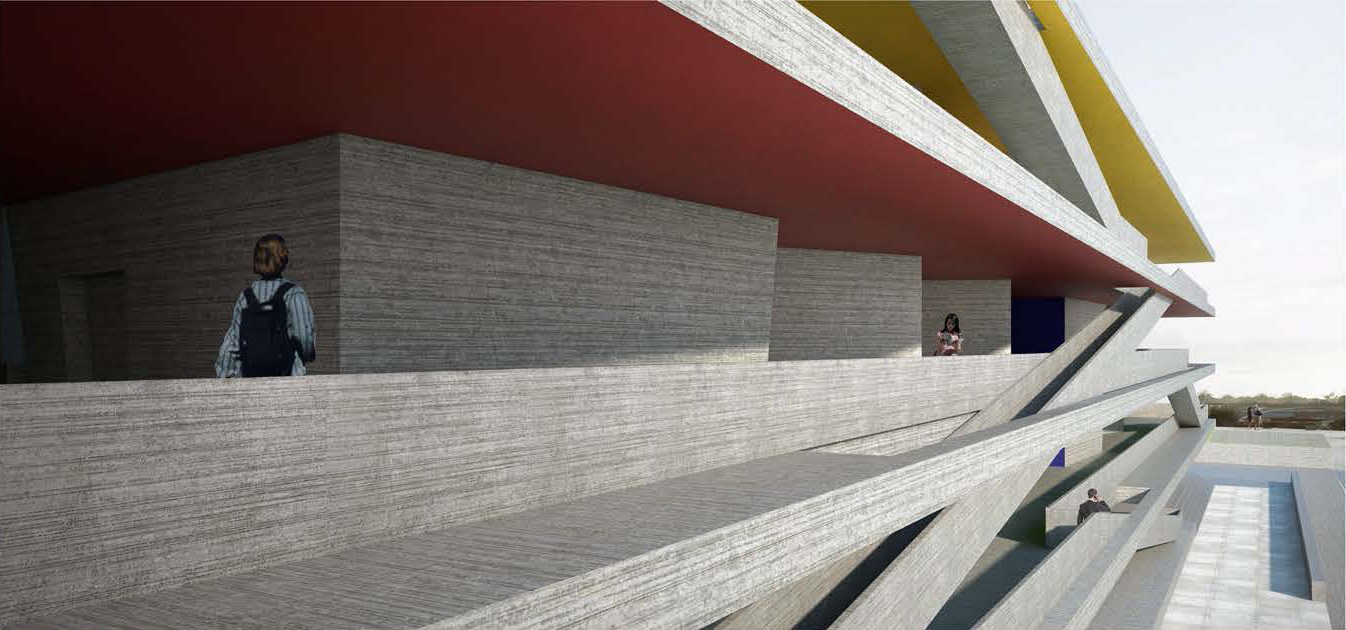 设计起源于对柯布西耶多米诺体系进行重构,用筒空间替代柱网作为支撑体系,将筒空间通过围合形成沉静的场所,空间首层通过削切,形成四周开放并与环境互通通道,内部空间通过模块空间拼合,流线环通,并与垂直交通向连。中部围合的空间也是知识博物馆精神场所,为人们提供了交流,休憩等多样性活动。在垂直的方向上,设计通过外挑檐廊进行遮阳,挑廊通过竖向坡道连接,最终通向屋顶,屋顶由下沉的森林广场构成,为人们提供了知识交流与共享的户外场所。
