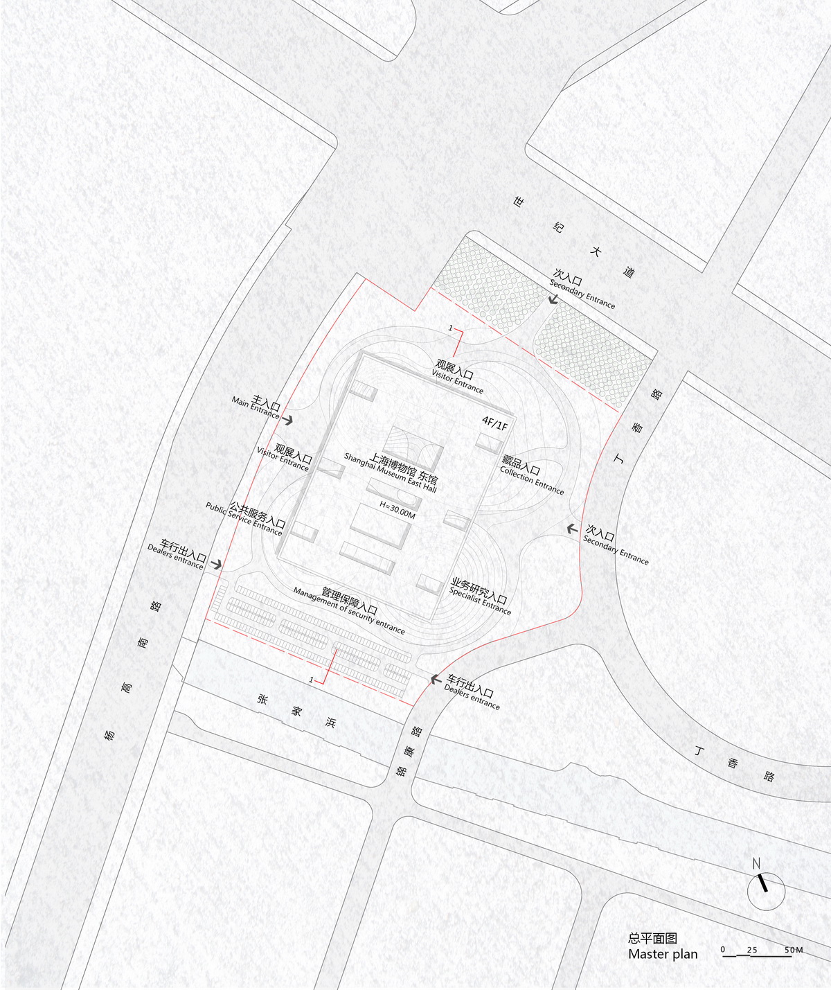 Different from the usual museum heavy sense, we have to intervene in the site with the attitude of blank-leaving, and create a narrative of urban spaces, and in contrast to the existing West Hall. Design space overhead placed on the "mountain", under the action of gravity to bend and produce a slight wrinkle on the surface, such as a natural echo of history "zero writing";The bamboo array in the partial hollow make the light scattered overhead in the square, and make the space pervaded quiet atmosphere.